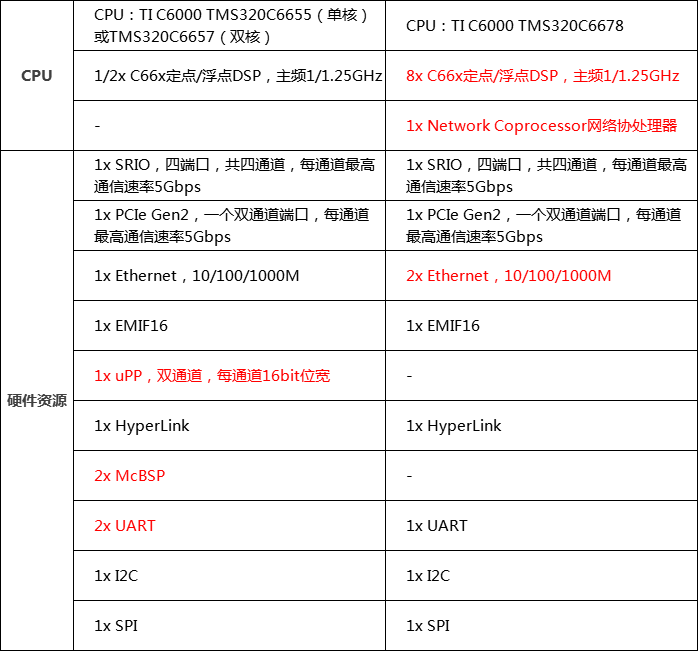 下圖將對(duì)比C665x與C6678在硬件資源上的異同。
