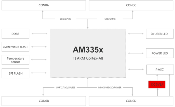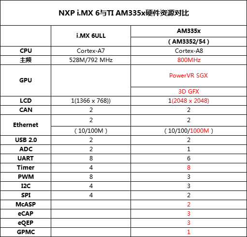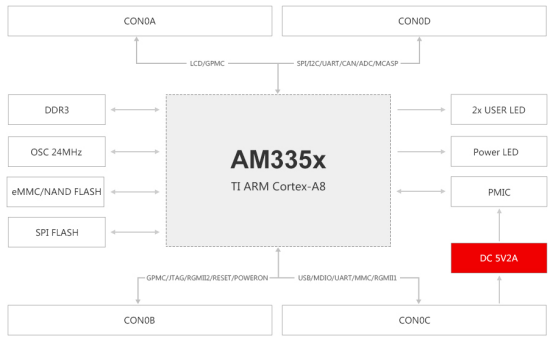 從上表可知AM335x主頻、顯示分辨率較高,并具有雙千兆網(wǎng)口、3D加速器、McASP、eCAP、eQEP等額外資源,且具有與FPGA進行高速通信的并行接口GPMC,也就是可通過FPGA拓展更多DI/DO、UART、CAN、網(wǎng)口、光口等接口。