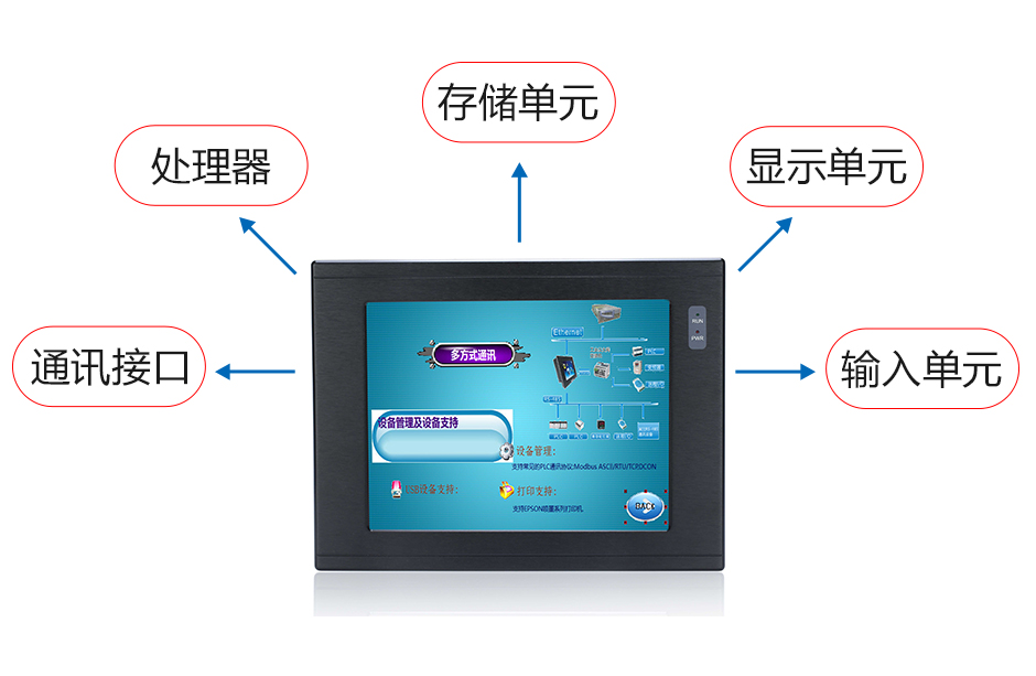 工業(yè)HMI由硬件和軟件兩部分組成,硬件部分包括處理器(一般為ARM、X86、單片機(jī)等)、顯示單元(顯示器、顯示屏等)、輸入單元(鍵盤、鼠標(biāo)、U盤等)、通訊接口(RS232、RS485、CAN、網(wǎng)口等)、數(shù)據(jù)存儲(chǔ)單元(NAND FLASH、eMMC、SD卡、SATA等)等,其中處理器的性能決定了HMI產(chǎn)品的性能高低,是HMI的核心單元。根據(jù)HMI的產(chǎn)品等級(jí)不同,處理器可分別選用8位、16位、32位的處理器。HMI軟件一般分為兩部分,即運(yùn)行于HMI硬件中的系統(tǒng)軟件和運(yùn)行于PC機(jī)Windows操作系統(tǒng)下的畫面組態(tài)軟件。使用者先使用HMI的畫面組態(tài)軟件制作“工程文件”,再通過PC機(jī)和HMI產(chǎn)品的串行通訊口,把編制好的“工程文件”下載到HMI的處理器中運(yùn)行。