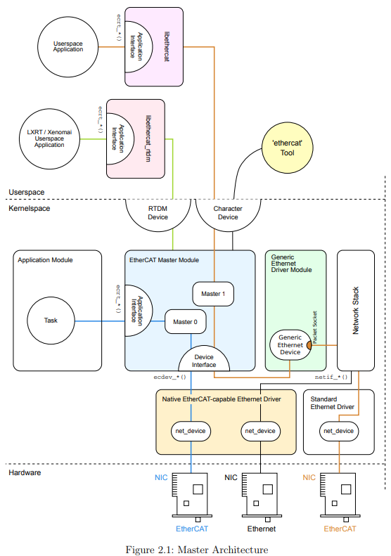 IgH EtherCAT為運行于Linux系統(tǒng)的免費開源EtherCAT主站程序,框架如下所示,官方文檔:https://www.etherlab.org/download/ethercat/ethercat-1.5.2.pdf。