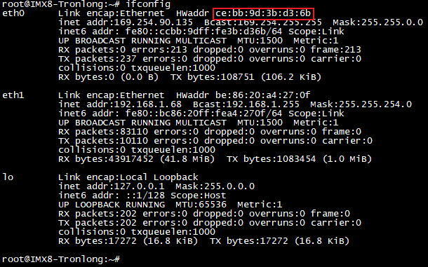將IgH EtherCAT主站程序文件夾整個拷貝至評估板文件系統(tǒng),執(zhí)行如下命令查詢評估板網(wǎng)卡物理地址。本次測試將IgH EtherCAT主站程序文件夾命名為__install。