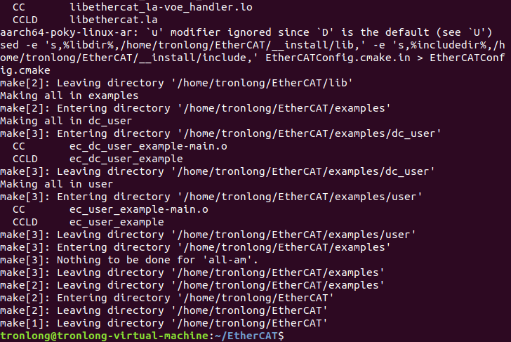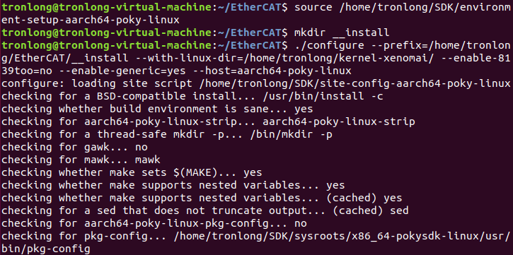 Host# ./configure --prefix=/home/tronlong/EtherCAT/__install --with-linux-dir=/home/tronlong/kernel-xenomai/ --enable-8139too=no --enable-generic=yes --host=aarch64-poky-linux