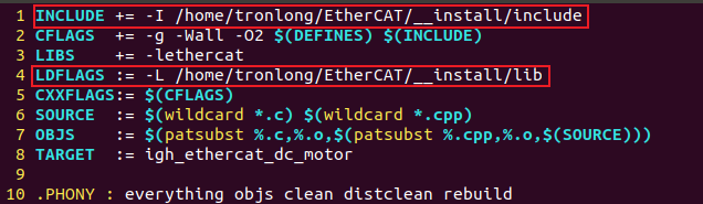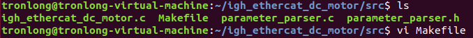請將案例"igh_ethercat_dc_motor\src\"目錄拷貝至Ubuntu工作目錄下,進入src目錄執(zhí)行如下命令修改Makefile相關(guān)內(nèi)容為IgH EtherCAT主站程序?qū)夸洝?/span>