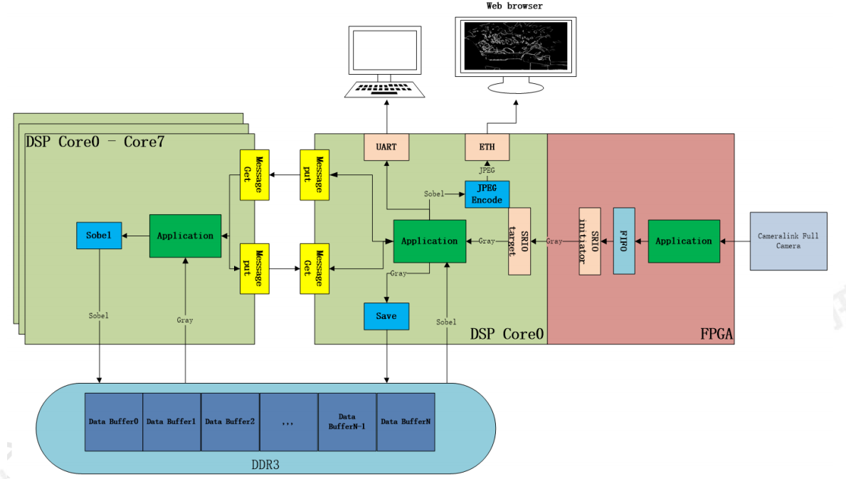 (1)基于TL6678ZH-EVM評(píng)估板接入CameraLink相機(jī)采集圖像,把圖像數(shù)據(jù)傳輸?shù)紻SP進(jìn)行Sobel(邊緣檢測(cè))算法處理(客戶可自行替換為目標(biāo)追蹤算法),最后通過網(wǎng)絡(luò)輸出處理結(jié)果。