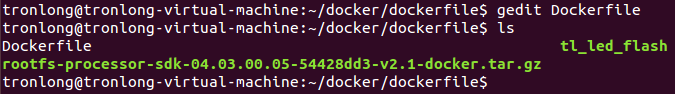 請(qǐng)?jiān)赨buntu上新建工作目錄“/home/tronlong/docker/dockerfile/”,并將產(chǎn)品資料“4-軟件資料\Linux\Filesystem\”目錄下的文件系統(tǒng)壓縮包rootfs-processor-sdk-04.03.00.05-54428dd3-v2.1-docker.tar.gz和產(chǎn)品資料“4-軟件資料\Demo\tl-linux-application\base-demos\tl_led_flash\bin\”目錄下的可執(zhí)行文件拷貝至Ubuntu共享目錄下,再執(zhí)行如下命令拷貝至工作目錄。