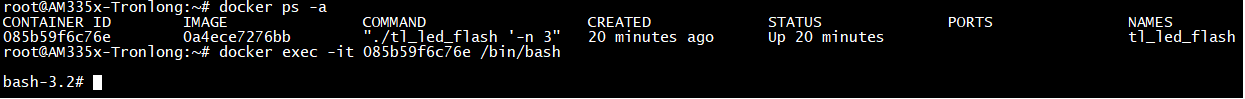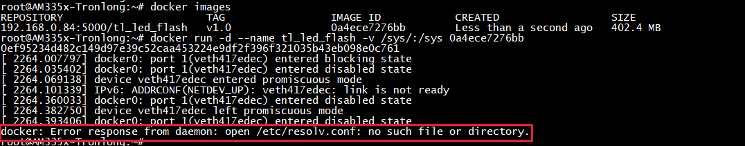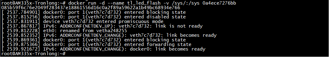 Target# docker run -d --name tl_led_flash -v /sys/:/sys 0a4ece7276bb