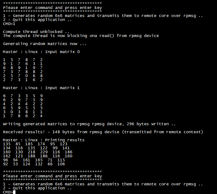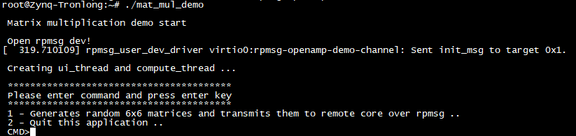 案例功能:CPU0隨機生成兩個矩陣并使用RPMsg向CPU1發(fā)送數(shù)據(jù),CPU1接收到數(shù)據(jù)后進行矩陣乘法運算,再使用RPMsg向CPU0回傳運算結(jié)果,然后CPU0通過串口終端輸出運算結(jié)果。