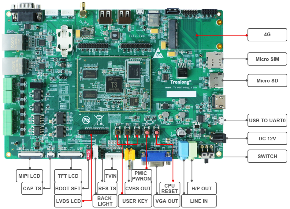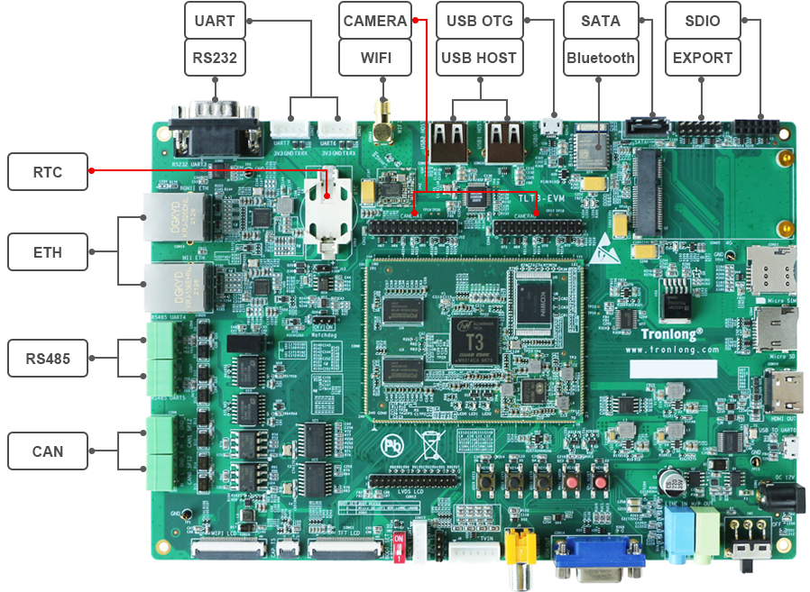 核心板配套的評估板接口資源豐富,引出雙路網(wǎng)口、雙路CAN、雙路USB、雙路RS485等通信接口,板載Bluetooth、WIFI、4G(選配)模塊,同時(shí)引出MIPI LCD、LVDS LCD、TFT LCD、CVBS OUT、CAMERA、LINE IN、H/P OUT等音視頻多媒體接口,支持雙屏異顯、1080P@45fps H.264視頻硬件編解碼,并支持SATA大容量存儲(chǔ)接口。