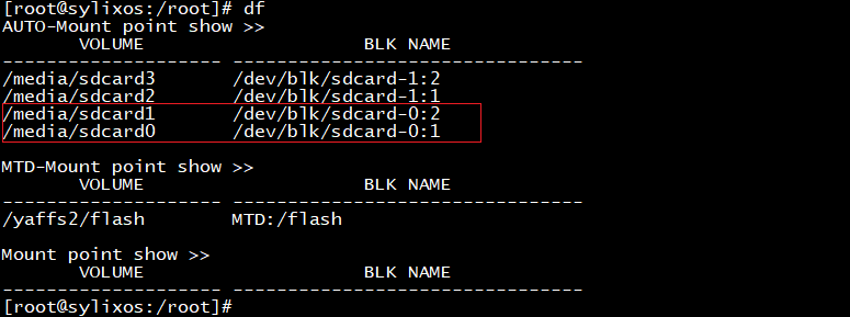 執(zhí)行df命令,可查看Micro SD的設(shè)備節(jié)點(diǎn)為sdcard-0,包含兩個(gè)可見分區(qū),掛載路徑分別為media目錄下的sdcard0、sdcard1,如下圖所示。