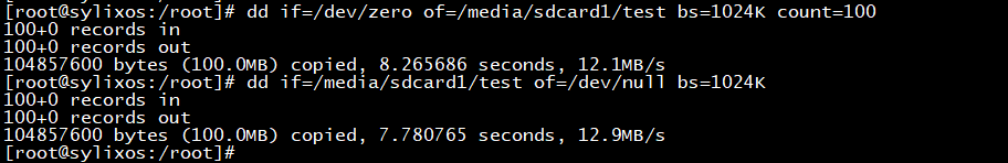 Target# dd if=/dev/zero of=/media/sdcard1/test bs=1024K count=100