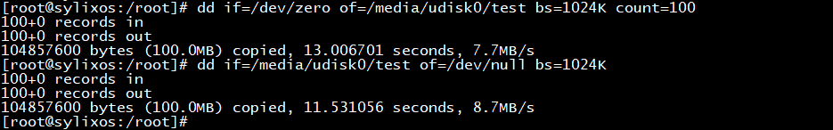 Target# dd if=/dev/zero of=/media/udisk0/test bs=1024K count=100