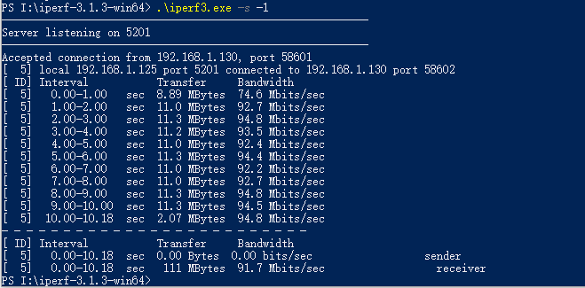 請使用網(wǎng)線將評估板MII ETH網(wǎng)口直連至PC機(jī)網(wǎng)口,并已設(shè)置為同一網(wǎng)段。在Windows PowerShell終端進(jìn)入iperf-3.1.3-win64工具解壓目錄,執(zhí)行如下命令。