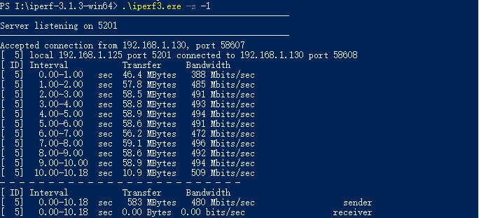 在Windows PowerShell終端進(jìn)入iperf-3.1.3-win64工具解壓目錄,執(zhí)行如下命令。