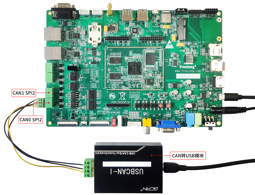 請先按照調(diào)試工具安裝文檔安裝CAN接口調(diào)試工具ECAN Tools。使用USB轉(zhuǎn)CAN模塊連接評估板CAN0 SPI2(CON9)或CAN1 SPI2(CON8)接口至PC機(jī)USB接口,本次操作以CAN0 SPI2接口為例進(jìn)行演示。