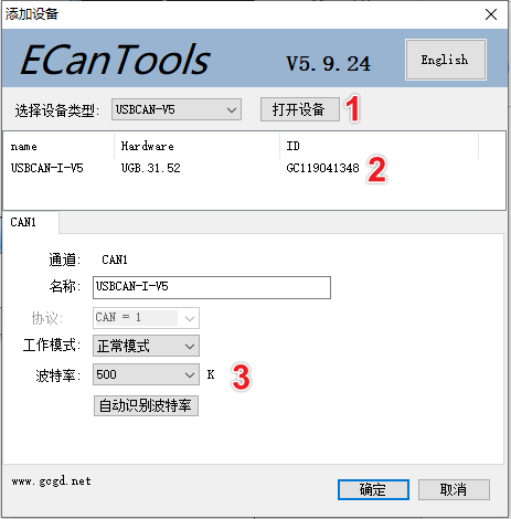 在PC端打開ECANTools軟件,選擇設(shè)備類型,然后點(diǎn)擊“打開設(shè)備”。選中軟件檢測到設(shè)備后,設(shè)置波特率為500K,點(diǎn)擊“確定”。