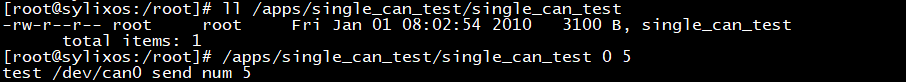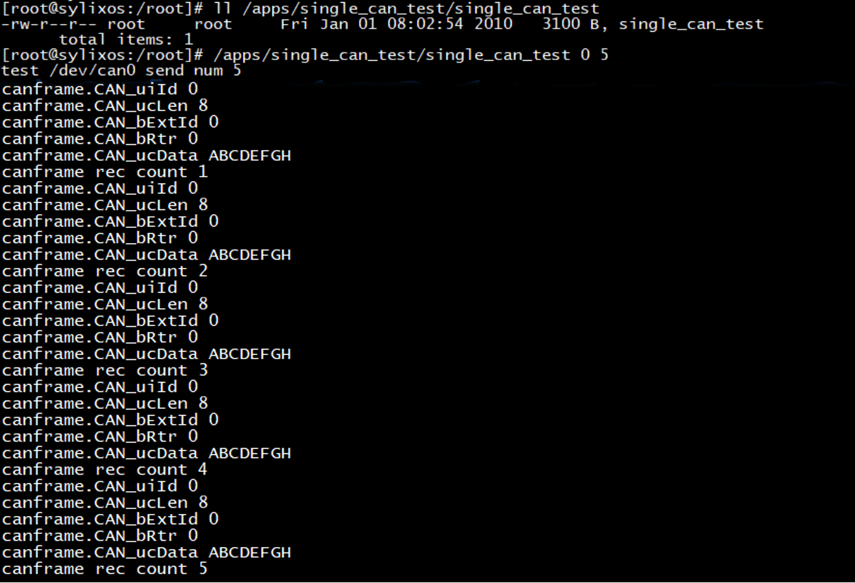 執(zhí)行如下命令,發(fā)送程序設(shè)定的數(shù)據(jù)幀到PC機(jī)ECANTools軟件。參數(shù)“0”表示CAN0 SPI2接口(參數(shù)“1”表示CAN1 SPI2接口),參數(shù)“5”表示發(fā)送的數(shù)據(jù)幀數(shù)量。