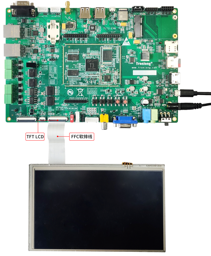 請通過FFC軟排線將TL070A LCD顯示屏與評估板TFT LCD(CON11)接口連接,硬件連接如下圖所示。