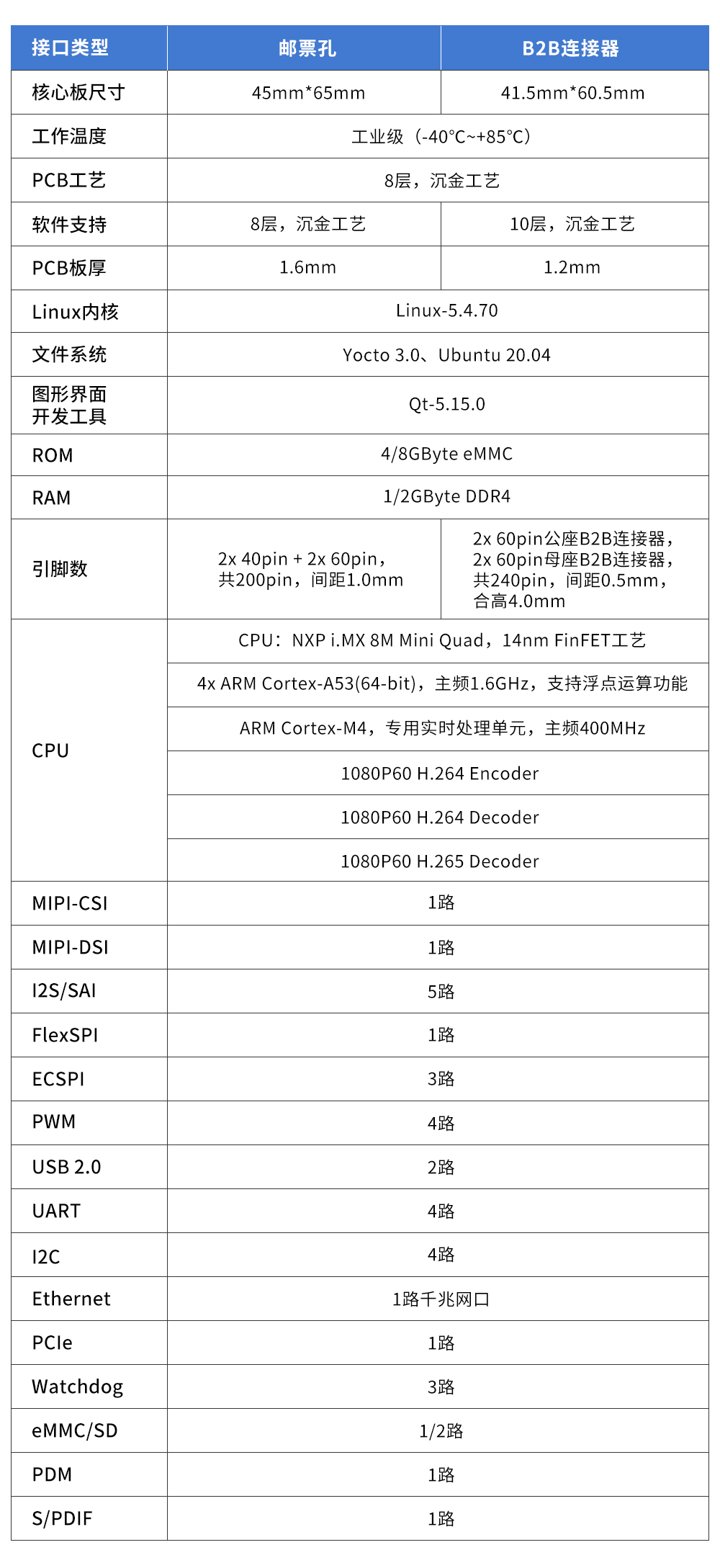 為滿足更多客戶的選型需求,創(chuàng)龍科技推出i.MX 8M Mini核心板有工業(yè)級B2B連接器和郵票孔兩種版本,硬件參數(shù)如下。
