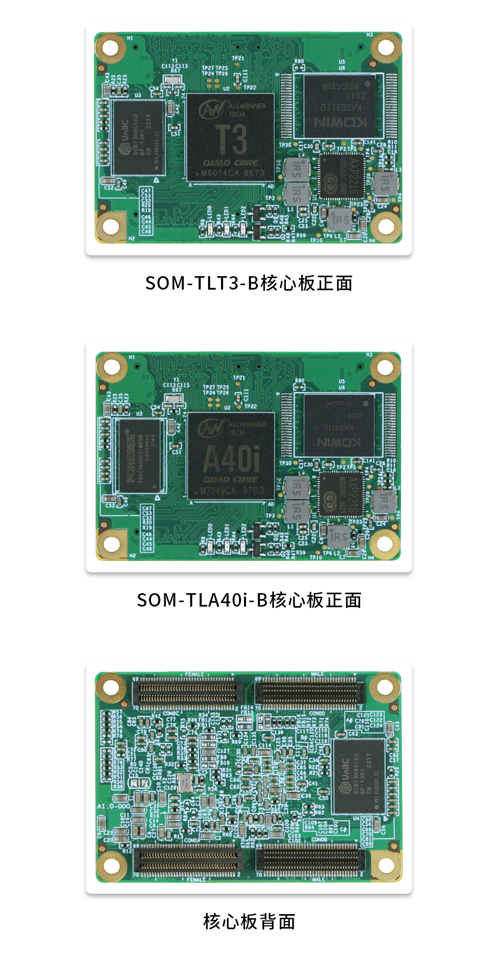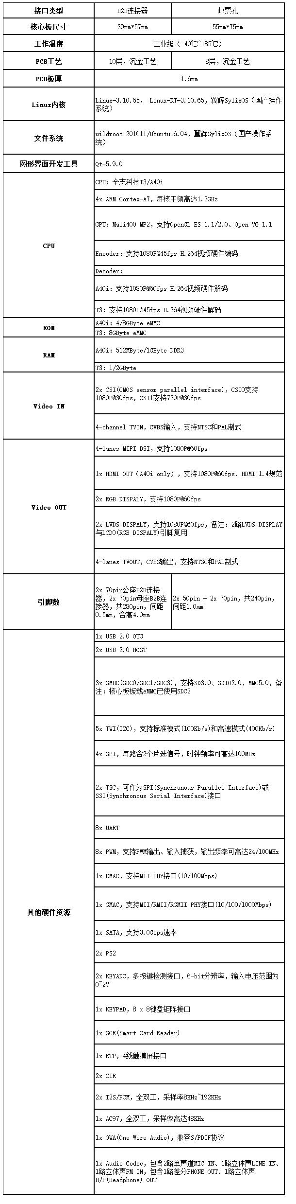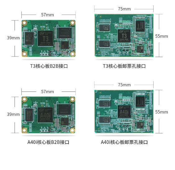 為滿足更多客戶的選型需求,創(chuàng)龍科技推出的T3/A40i核心板有工業(yè)級B2B連接器和郵票孔兩種版本,硬件參數(shù)如下。