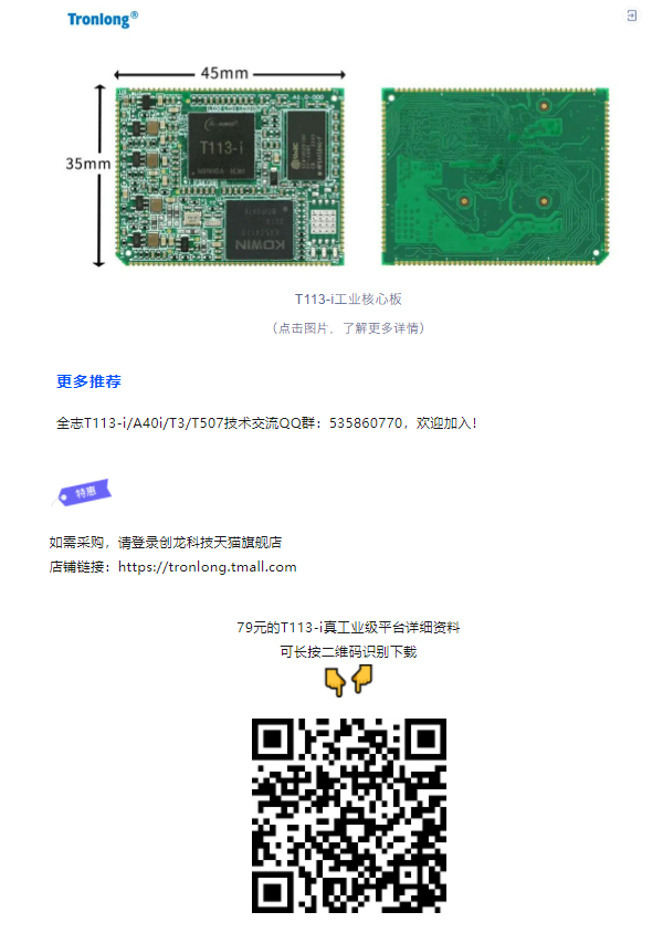 為了讓更多用戶(hù)輕松選擇T113-i平臺(tái),即日起,創(chuàng)龍科技T113-i核心板價(jià)格全面下調(diào),一片含稅就僅需79元(原價(jià)99元)!雙核ARM Cortex-A7@1.2GHz,-40℃~ + 85℃真工業(yè)級(jí)!!!