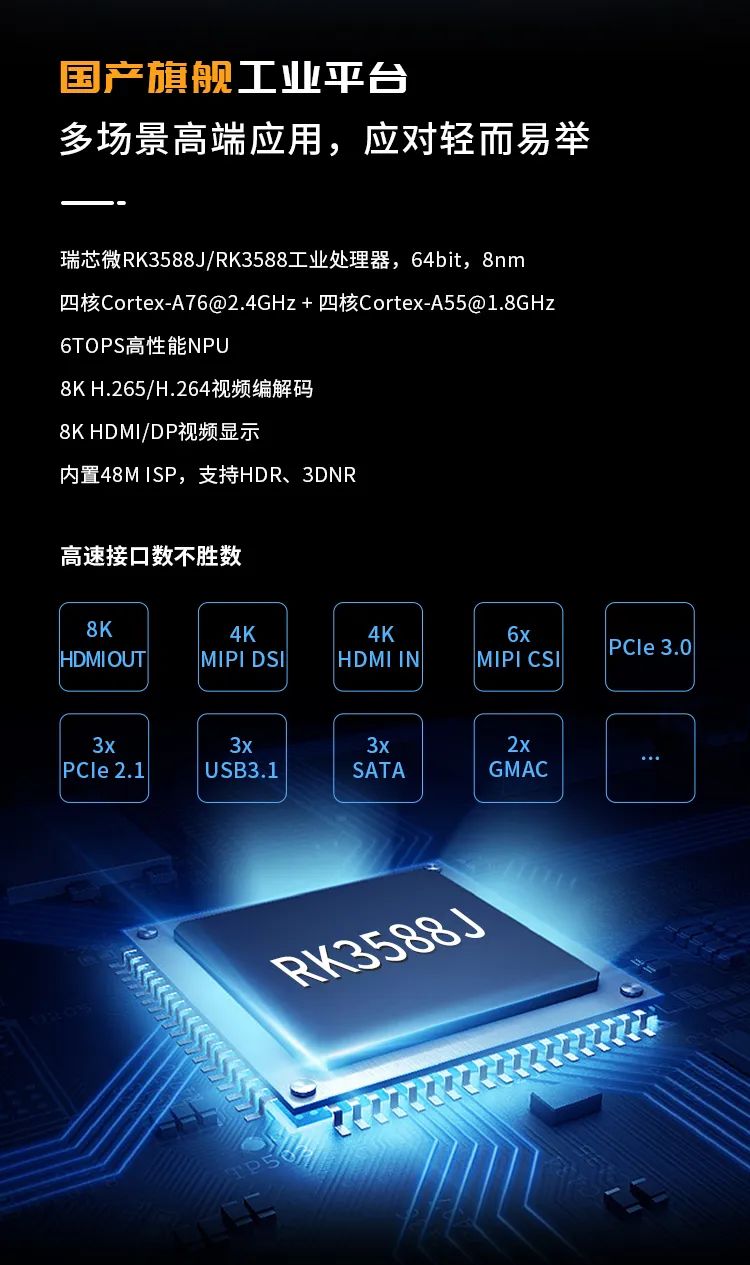 SOM-TL3588工業(yè)核心板是基于瑞芯微RK3588J/RK3588高性能處理器設(shè)計的四核ARM Cortex-A76 + 四核ARM Cortex-A55全國產(chǎn)工業(yè)核心板,Cortex-A76核心主頻高達2.0GHz/2.4GHz,Cortex-A55核心主頻高達1.7GHz/1.8GHz,同時擁有6TOPS超強算力NPU,支持8K H.265/H.264視頻編解碼以及PCIe 3.0、3路PCIe 2.1、3路USB3.1、3路SATA、2路GMAC等高速工業(yè)接口。