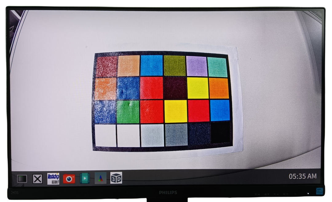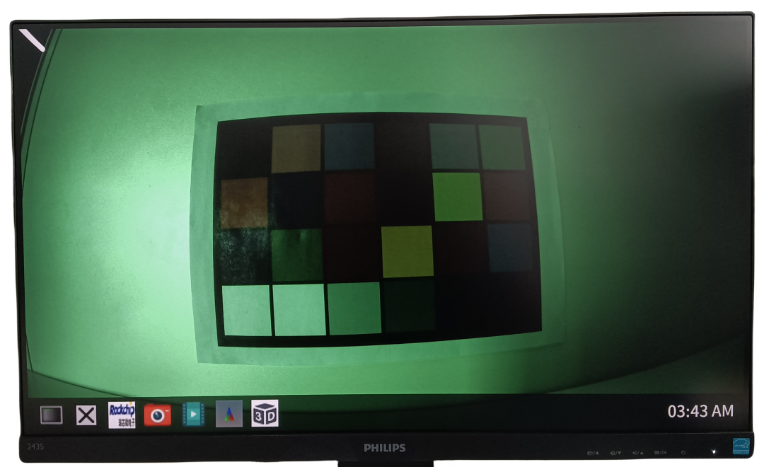 可以觀察到,HDMI顯示屏實時顯示攝像頭采集的原始圖像偏綠色且暗淡。