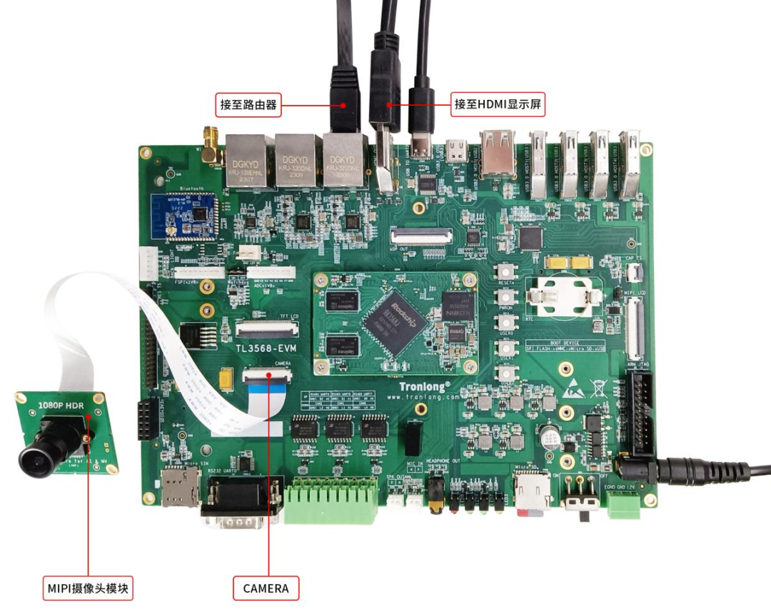 評估板默認已支持HDMI OUT顯示,請將評估板HDMI OUT接口連接至HDMI顯示屏,使用FFC軟排線將MIPI攝像頭模塊(型號為MCAM400)連接至評估板CAMERA接口,通過網(wǎng)線將評估板千兆網(wǎng)口ETH0 RGMII連接至路由器。硬件連接如下圖所示。