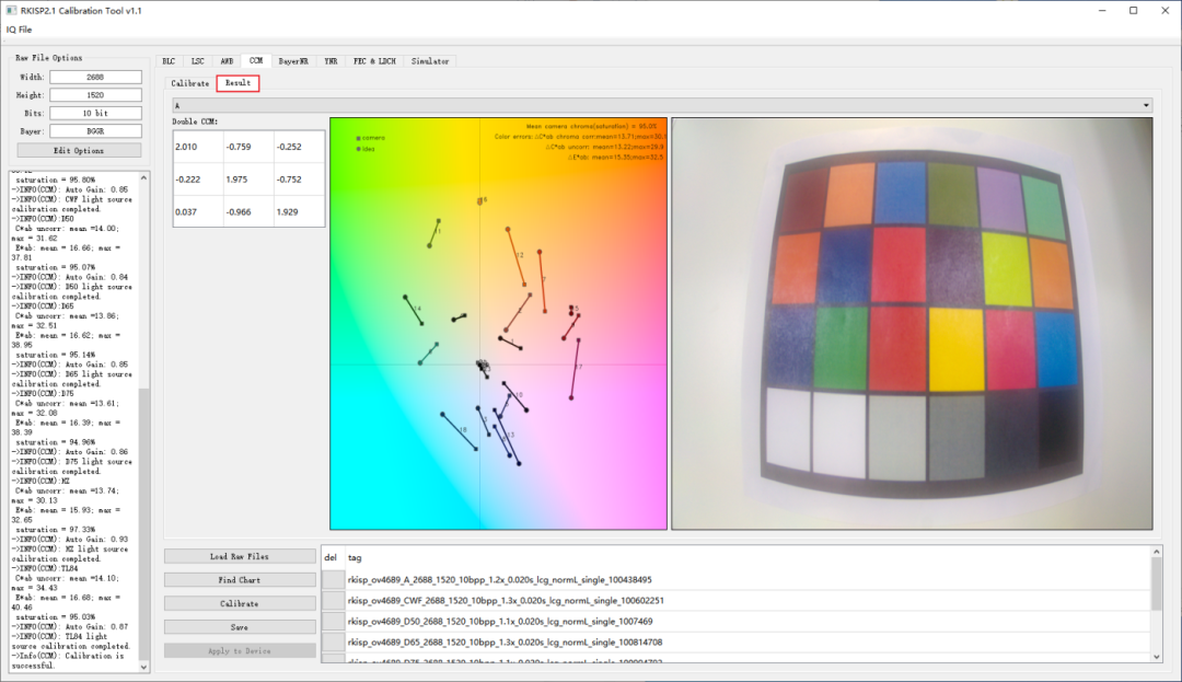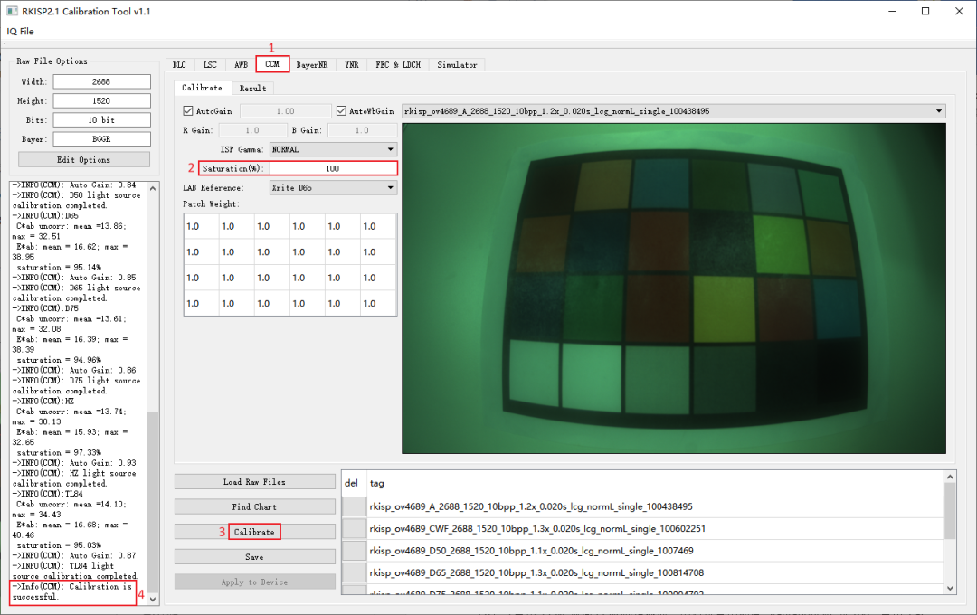 打開RKISP2.x Tuner工具,導入原始圖像后,進入CCM標定界面,然后設置飽和度,點擊"Calibrate"開始標定。