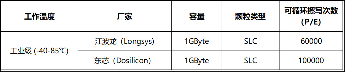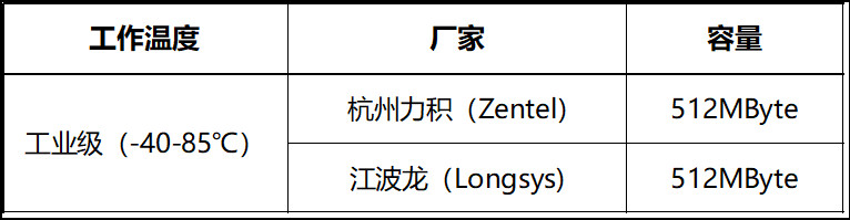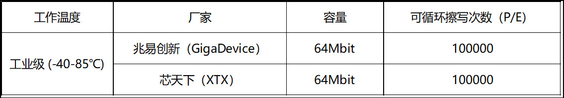 核心板通過(guò)CPU的SPI總線連接國(guó)產(chǎn)工業(yè)級(jí)SPI FLASH,采用的國(guó)產(chǎn)工業(yè)級(jí)SPI FLASH如下表所示。