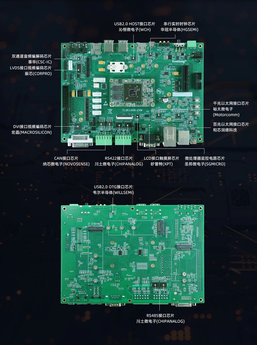 評(píng)估板由核心板和評(píng)估底板組成,所有元器件均采用國(guó)產(chǎn)工業(yè)級(jí)方案,接口資源豐富、支持選配多個(gè)模塊。