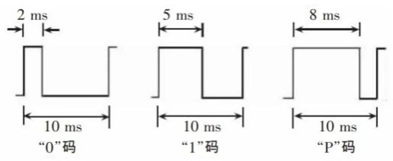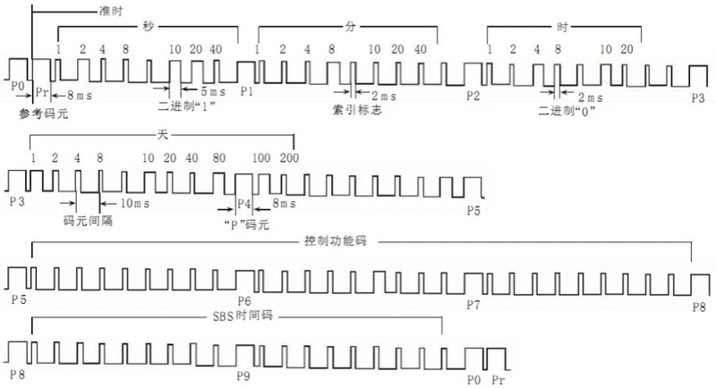 IRIG-B碼為每秒一幀的時間串碼,一幀串碼中包含100個碼元,頻率為1KHz,即每個碼元占用10ms時間。IRIG-B碼基本的碼元為"0"碼元、"1"碼元和"P"碼元,"0"碼元和"1"碼元對應的脈沖寬度為2ms和5ms,"P"碼元為位置碼元,對應的脈沖寬度為8ms,IRIG-B碼信息的基本碼元的示意圖如下所示。