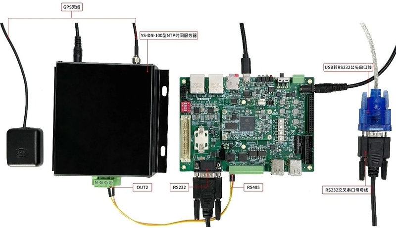 將評估板的調試串口CON4(USB TO UART0)連接至PC機,將評估板的RS232串口連接至PC機,將衛(wèi)星時鐘同步裝置的ANT接口連接至GPS天線模塊,將衛(wèi)星時鐘同步裝置OUT2接口連接至評估板的RS485接口,硬件連接如下圖所示。