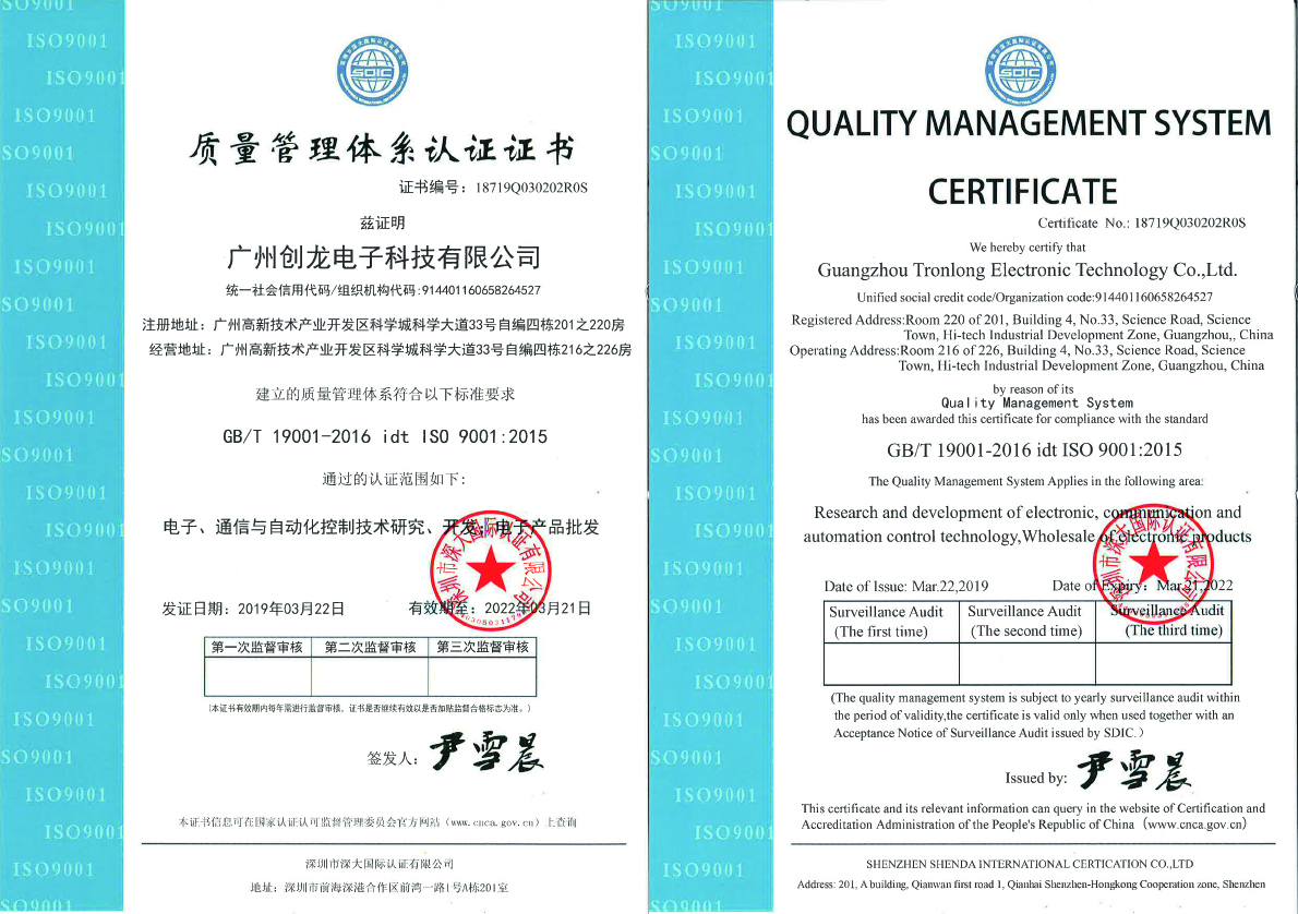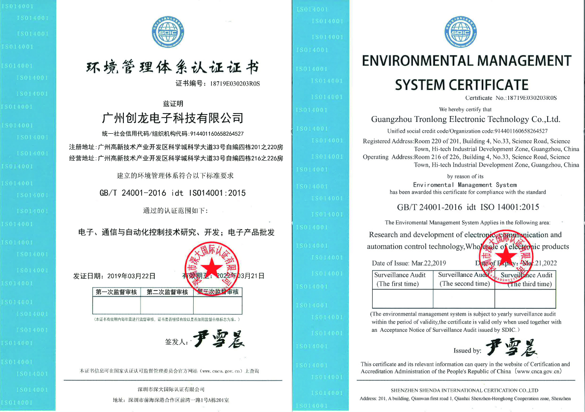 自成立以來,廣州創(chuàng)龍電子科技有限公司(以下簡稱“創(chuàng)龍”)一直貫徹以高品質(zhì)工業(yè)核心板為經(jīng)營理念,并在產(chǎn)品的質(zhì)量品質(zhì)和服務(wù)的專業(yè)全面上做出了巨大的投入。為更加全面地貫徹該經(jīng)營理念,從戰(zhàn)略的眼光出發(fā),創(chuàng)龍從2018年開始開展與導(dǎo)入ISO9001質(zhì)量管理體系認(rèn)證、ISO14001環(huán)境管理體系認(rèn)證,并于2019年03月22日正式通過認(rèn)證并獲得由深圳市深大國際認(rèn)證機構(gòu)頒發(fā)的質(zhì)量管理體系、環(huán)境管理體系認(rèn)證證書。