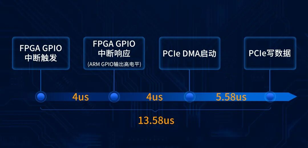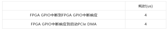 從上圖RS232 UART0串口終端的打印信息可知,FPGA GPIO中斷響應(yīng)到啟動(dòng)PCIe DMA的最大耗時(shí)為4us。