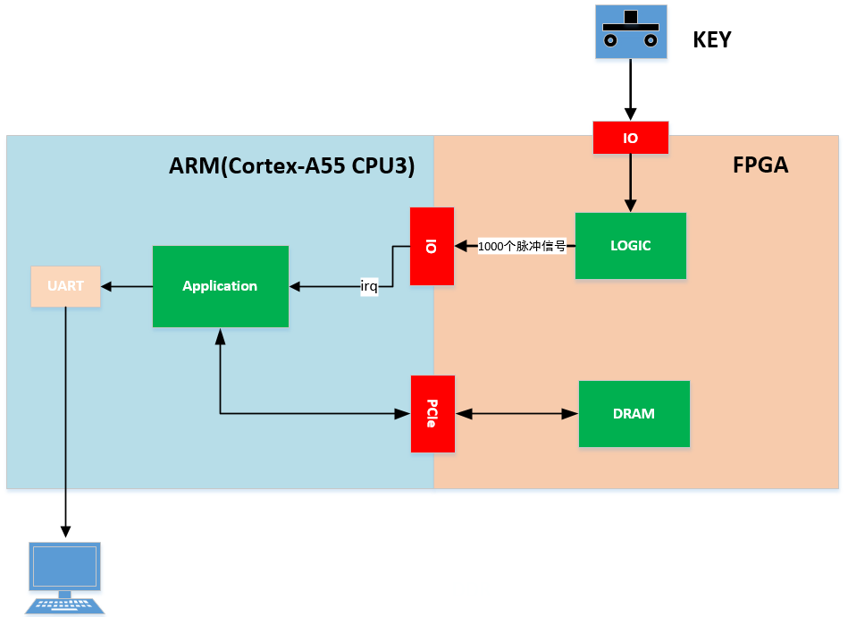 案例通過PCIe DMA在FPGA端(PCIe EP)與ARM端(PCIe RC)之間建立高速數(shù)據(jù)傳輸通道,由FPGA端按鍵觸發(fā)GPIO中斷啟動(dòng)數(shù)據(jù)傳輸,動(dòng)態(tài)調(diào)整1KByte、16KByte、32KByte、64KByte數(shù)據(jù)量并統(tǒng)計(jì)傳輸速率、延遲及誤碼率。