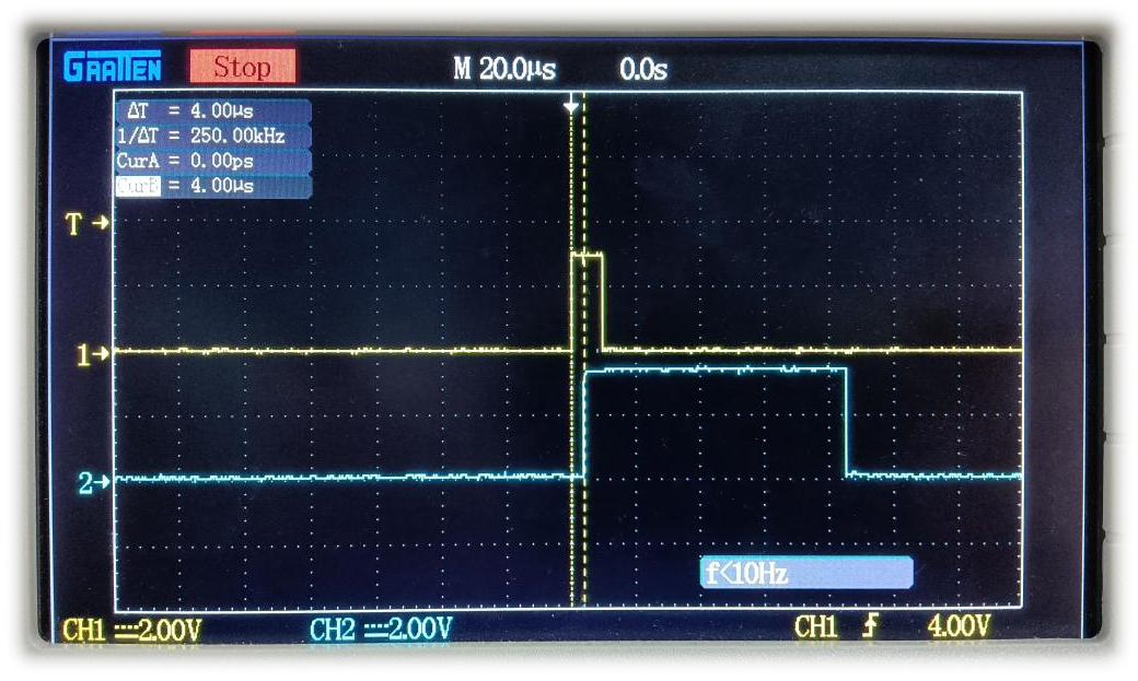 如下圖所示,使用示波器測量FPGA GPIO(黃色波形)中斷觸發(fā)至ARM GPIO(藍(lán)色波形)輸出高電平的實(shí)際耗時(shí),可看到FPGA GPIO信號(hào)上升沿至ARM GPIO信號(hào)上升沿的時(shí)間間隔約為4us,即FPGA GPIO中斷響應(yīng)時(shí)間約為4us;