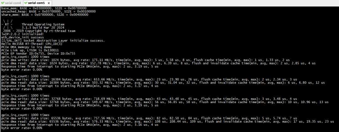RS232 UART0串口終端將打印GPIO中斷次數(shù)、GPIO中斷響應(yīng)到啟動(dòng)PCIe DMA的耗時(shí)、PCIe平均讀寫速率、PCIe讀寫耗時(shí)、誤碼率等相關(guān)信息,如下圖所示。