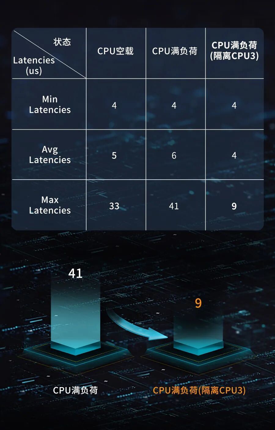 根據(jù)CPU空載、CPU滿負(fù)荷、隔離CPU核心三種狀態(tài)的測試結(jié)果可知:當(dāng)程序指定至隔離的CPU3核心上運行時,Linux系統(tǒng)延遲降低,可有效提高系統(tǒng)實時性。故推薦對實時性要求較高的程序(功能)指定至隔離的CPU核心運行。