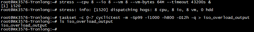 運行stress壓力測試工具,使得CPU處于滿負(fù)荷狀態(tài)。再使用taskset工具將cyclictest測試程序運行在CPU3核心,測試CPU3核心滿負(fù)荷狀態(tài)下的系統(tǒng)實時性能。