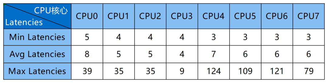 對測試結(jié)果文件的數(shù)據(jù)進(jìn)行分析,使用腳本生成直方圖,得到隔離CPU核心狀態(tài)下的統(tǒng)計結(jié)果如下所示。本次測試中,CPU4核心Max Latencies值最大,為124us,隔離CPU3核心的Max Latencies值最小,為9us。