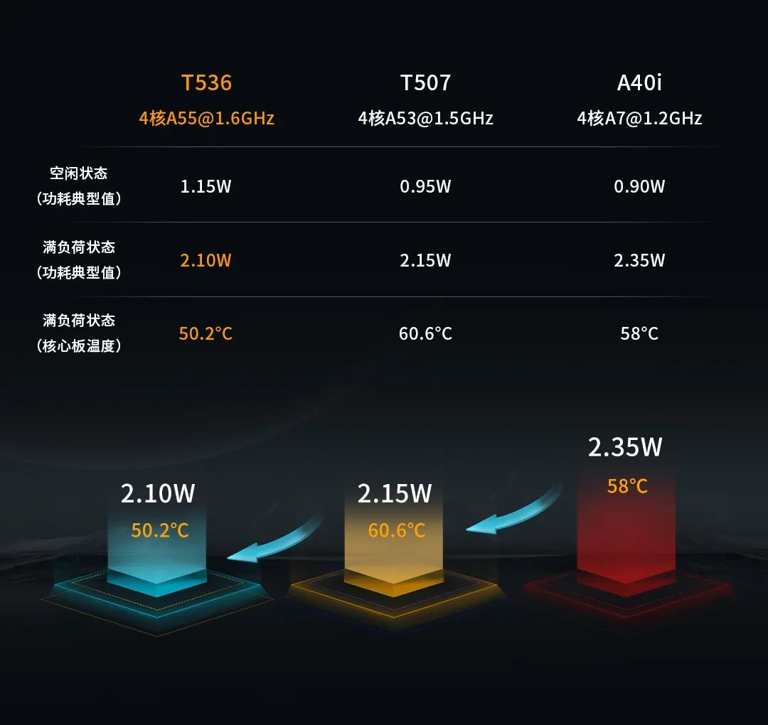 相較T507與A40i,創(chuàng)龍科技T536工業(yè)核心板在滿負(fù)荷狀態(tài)下,功耗更低、散熱能力更強。