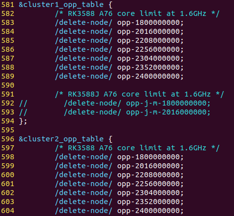 通過修改內核源碼"arch/arm64/boot/dts/rockchip/"目錄下的內核設備樹文件tl3588-evm.dts相關內容,新增overdrive模式主頻頻率:1.800GHz和2.016GHz。