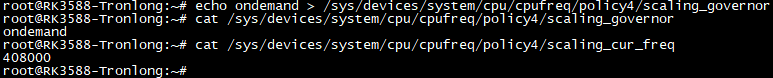 下圖演示將系統(tǒng)配置為ondemand策略。在系統(tǒng)空閑狀態(tài)下,可查看CPU主頻頻率自動調整為0.408GHz。
