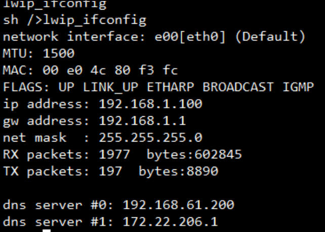 進(jìn)入OneOS系統(tǒng)后,在串口工具輸入lwip_ifconfig獲取評估板IP。