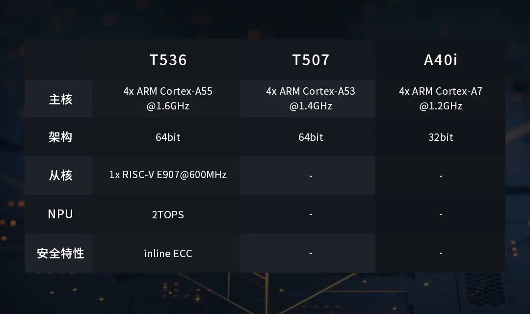 T536是一款工業(yè)級處理器,它的使命是打造一款超高性價比的工業(yè)應(yīng)用處理器,原廠打出來的口號是:專為工業(yè)應(yīng)用而生!它的關(guān)鍵參數(shù)如下: