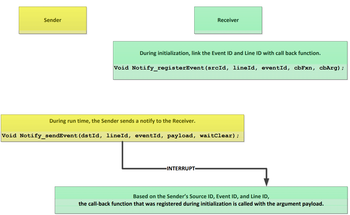 Notify通過(guò)硬件中斷傳輸消息,Receiver注冊(cè)Notify事件中斷,Sender通過(guò)Notify發(fā)送事件中斷,從而實(shí)現(xiàn)通知并攜帶小量消息的目的。