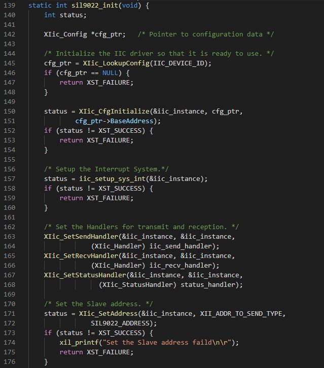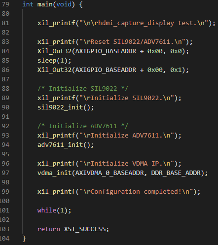 MicroBlaze裸機(jī)源碼為"sw\baremetal_demo\project\hdmi_capture_display\src\",關(guān)鍵代碼說明如下。