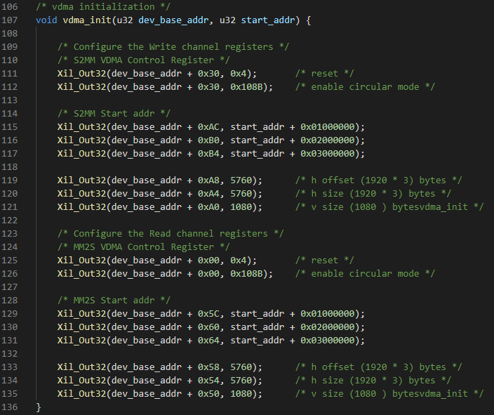 (2) 初始化VDMA,將采集到的視頻數(shù)據(jù)緩存至DDR,并將視頻數(shù)據(jù)搬運至AXI4-Stream to Video Out IP核,再進(jìn)行HDMI視頻輸出。