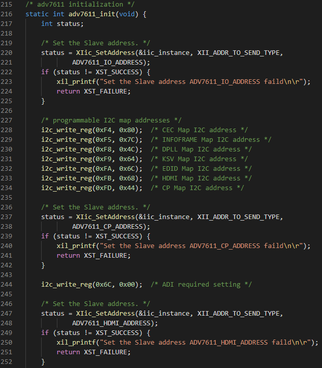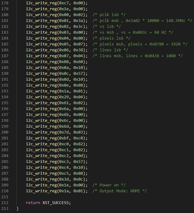 (1) 調(diào)用Sil9022A、ADV7611初始化函數(shù)。初始化前需先通過AXI GPIO IP核控制Sil9022A和ADV7611的復(fù)位引腳,使其復(fù)位后再進(jìn)行初始化。