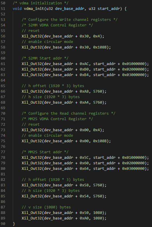 (1) 初始化VDMA,將采集到的視頻數(shù)據(jù)緩存至DDR,并將視頻數(shù)據(jù)搬運(yùn)至AXI4-Stream to Video Out IP核,再進(jìn)行SDI視頻輸出。